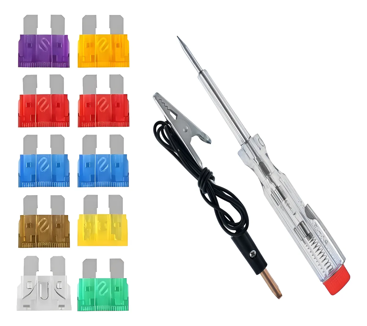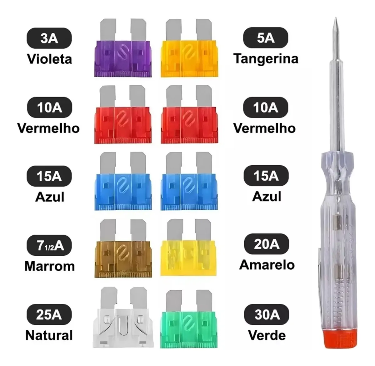 – Kit com 10 fusíveis de diversas amperagens, ideal para ter sempre a mão caso seja necessária a substituição de fusível no seu veículo.